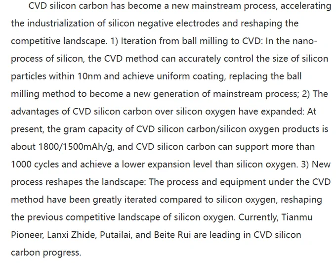 核心观点:CVD硅碳工艺的出现大幅提速硅负极的产业化,25年硅负极预计在手机领域扩大渗透,也有望在动力场景实现0-1,我们建议关注硅负极放量背景下,新工艺带来的产业链增量环节投资机会。