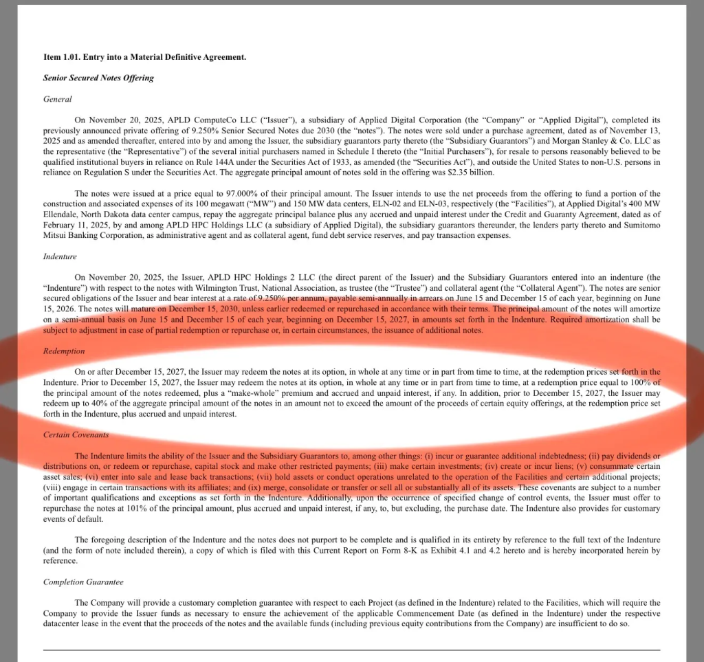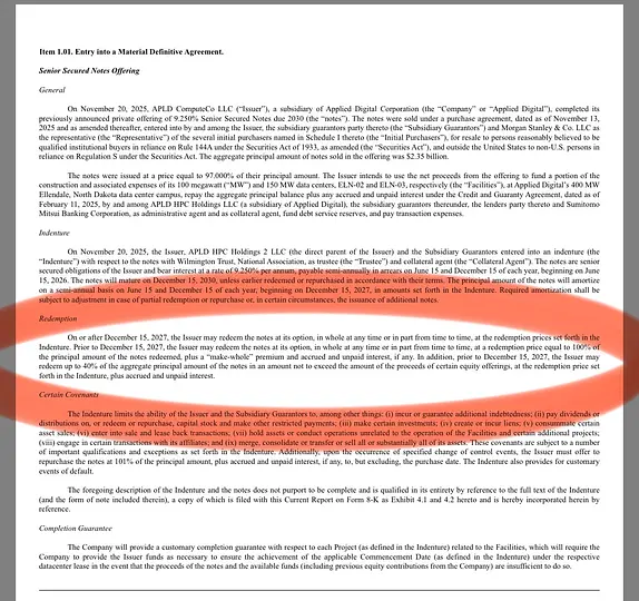 The $2.35 billion senior secured notes at 9.25% due 2030 are the real leverage concern. These were issued at 97% of par to fund construction of the 100 MW and 150 MW facilities at Polaris Forge 1. The notes are secured by first-priority liens on APLD Compute’s assets with full subsidiary guarantees. Applied Digital provides completion guarantees, meaning they fund whatever’s needed to finish construction if project financing falls short. That creates direct parent company obligation.