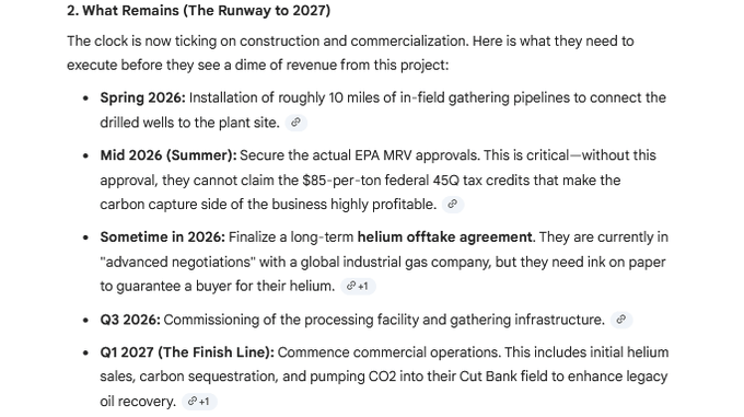 EPA MRV approvals expected summer 2026. Project financing and plant construction FID targeted Q2 2026. First helium sales Q1 2027. Each is an independent binary catalyst. MRV approval alone will likely move this stock materially.